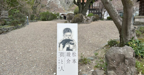 入ってすぐに女性が顔像を触っている松本竣介の大きな絵があります。