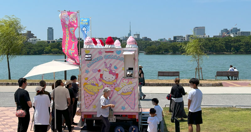 美術館に近づいていくとサンリオならではのかわいいピンクのキッチンカーが見えます。