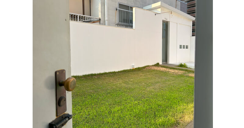 家具店の外に出ると暗い階段室あり、上まで行ってギギギと重たい木のドアを開けると芝生の庭が。