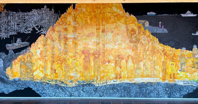 外のテラスから見える大きな横長の壁画が完成していました。