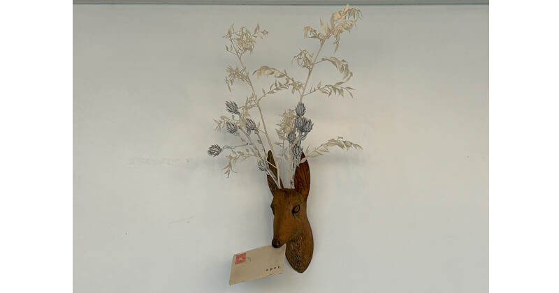 店内に降り立つと高低いくつかの木製テーブルの上に枯れ葉が敷いてあり、天井からアクセサリーを絡めたオブジェがたくさん吊るしてあります。